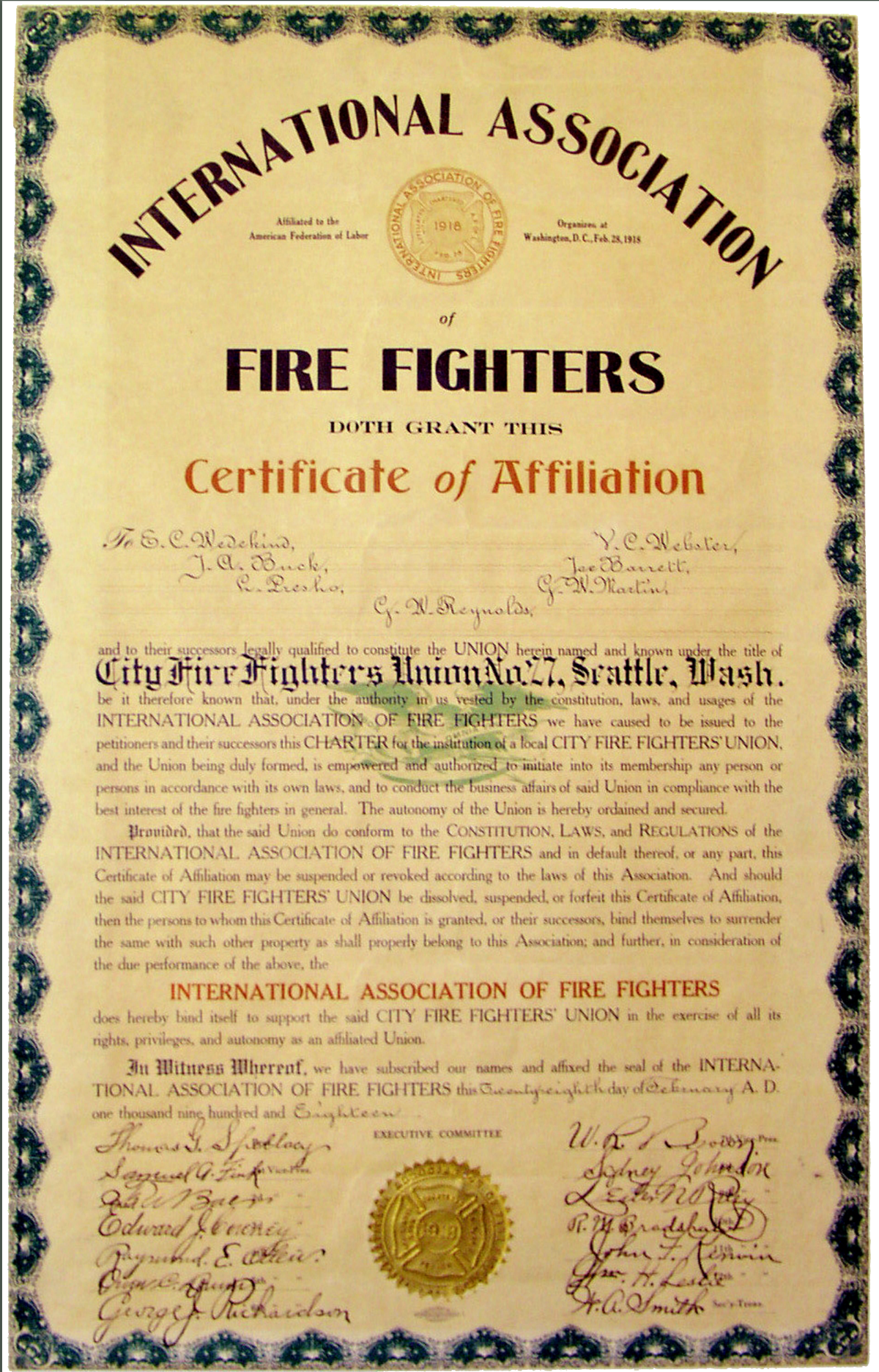 The Seattle Fire Department became a paid, professional department of 32 fire fighters in 1889, but it wasn’t until 1917 that the original City Fire Fighters Union No. 15462 was born. In 1918, the International Association of Fire Fighters (IAFF) was organized and the City Fire Fighters Union was admitted as Local 27, one of 218 charter locals.